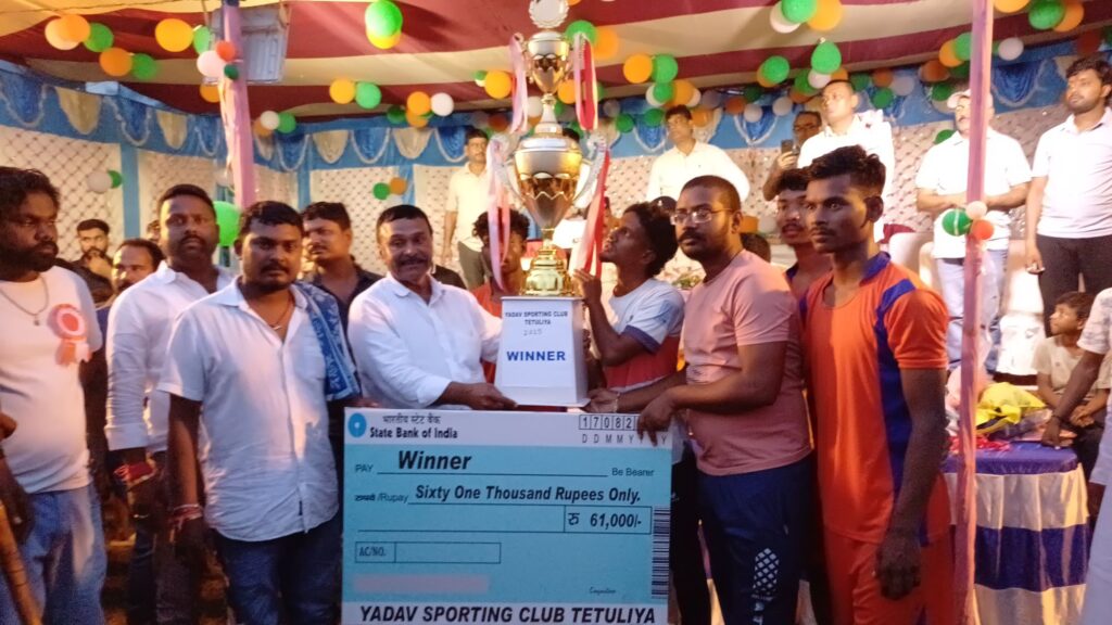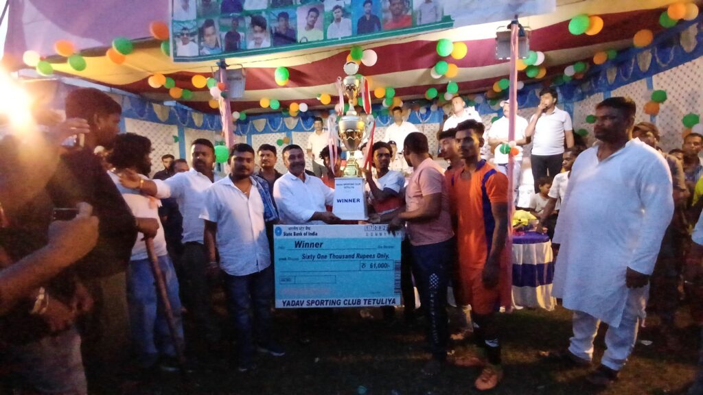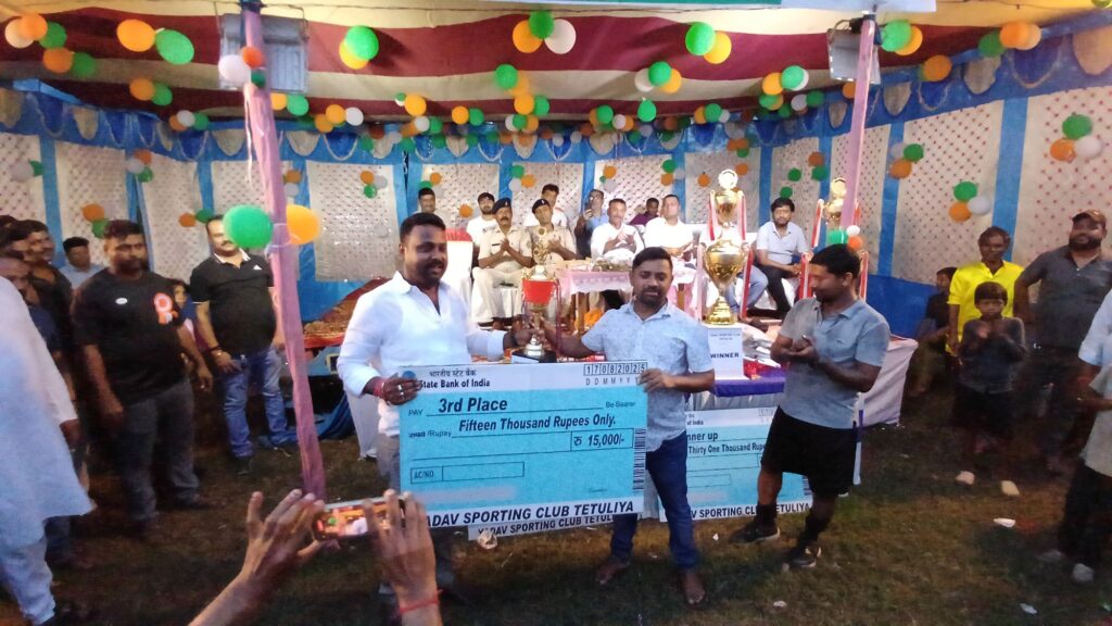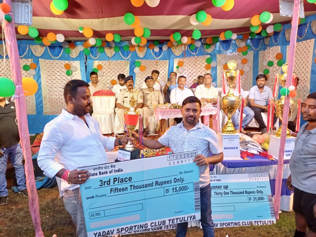 मुख्य अतिथि के रूप में उपस्थित पूर्व विधायक प्रत्याशी रोहित यादव ने विजेता टीम को ट्रॉफी और पुरस्कार वितरित किया। विशिष्ट अतिथि धर्माबांध थाना प्रभारी मनोज पांडे भी मौजूद रहे और खिलाड़ियों का हौसला बढ़ाया। इस टूर्नामेंट में कुल 32 टीमों ने हिस्सा लिया था।